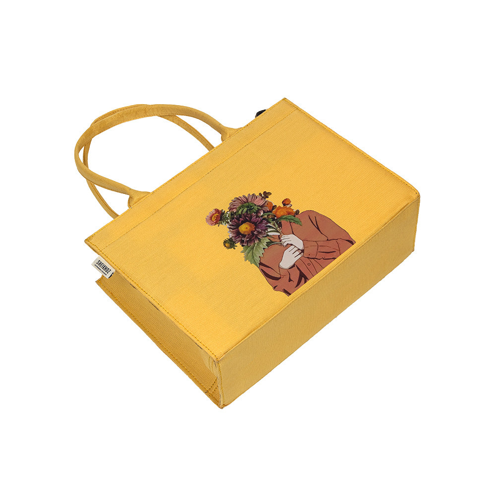 Embrace the charm of nature with the Floral Bliss Yellow Tote. Featuring a vibrant design of a girl holding a bouquet of fresh flowers, this tote brings a pop of color and elegance to any outfit. Crafted with eco-friendly canvas, this ladies handbag is perfect for adding a cheerful touch to your daily style.